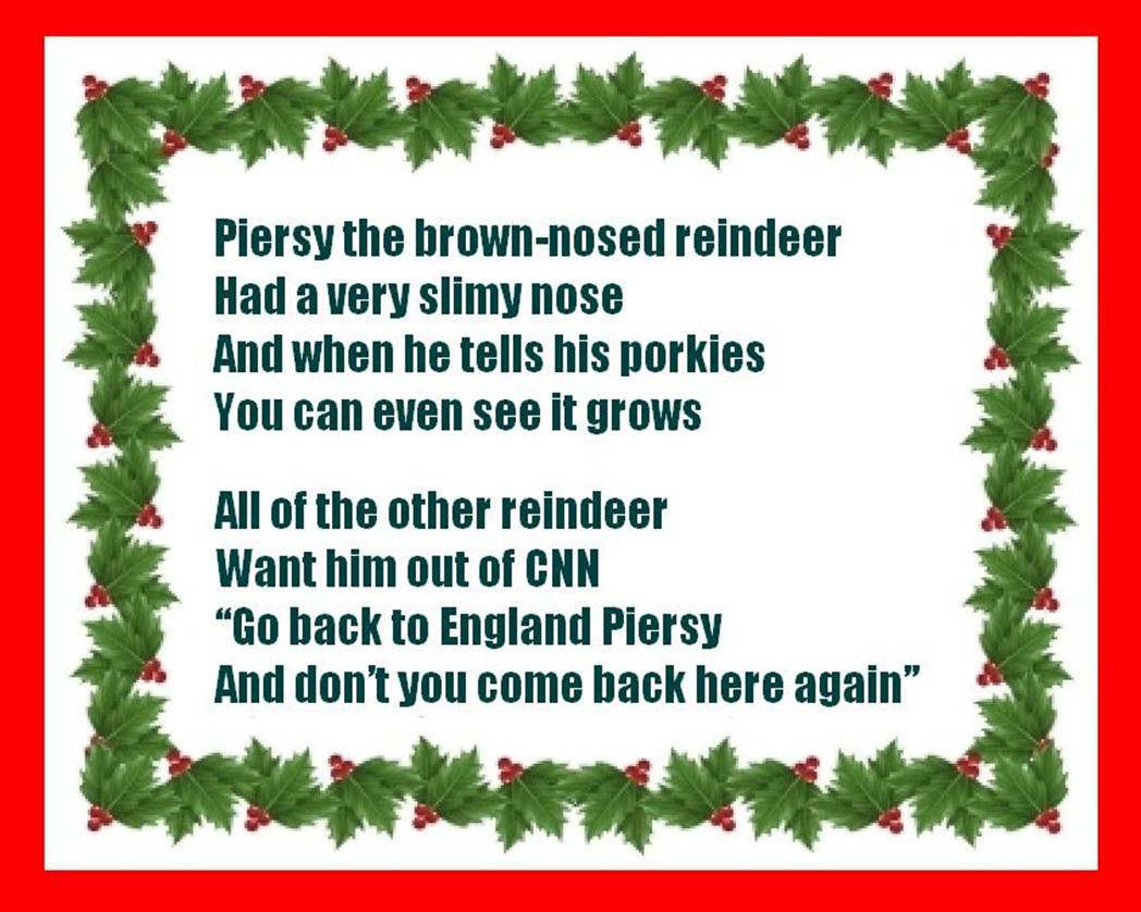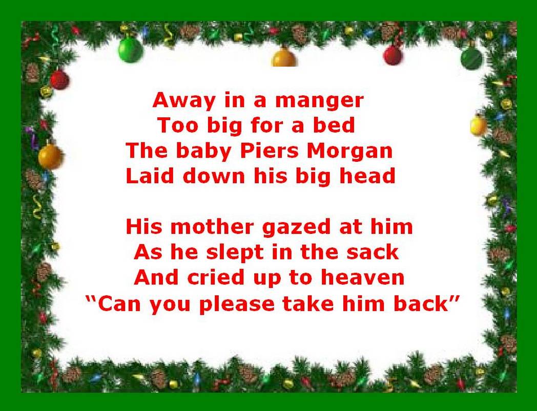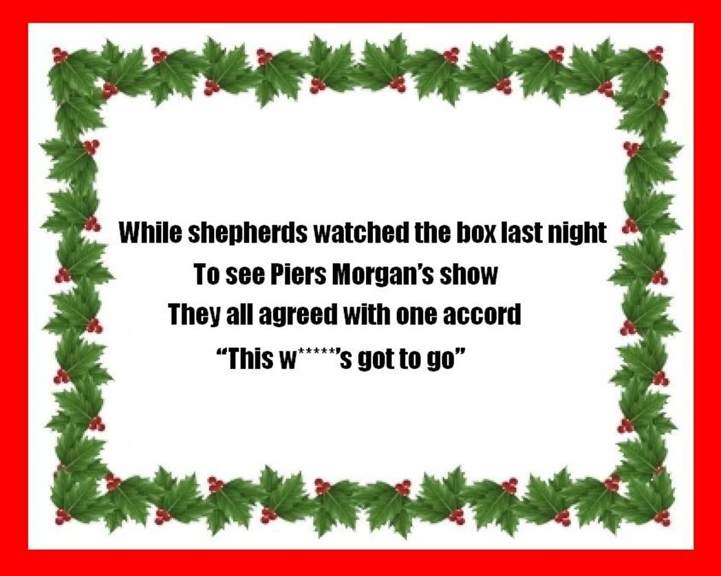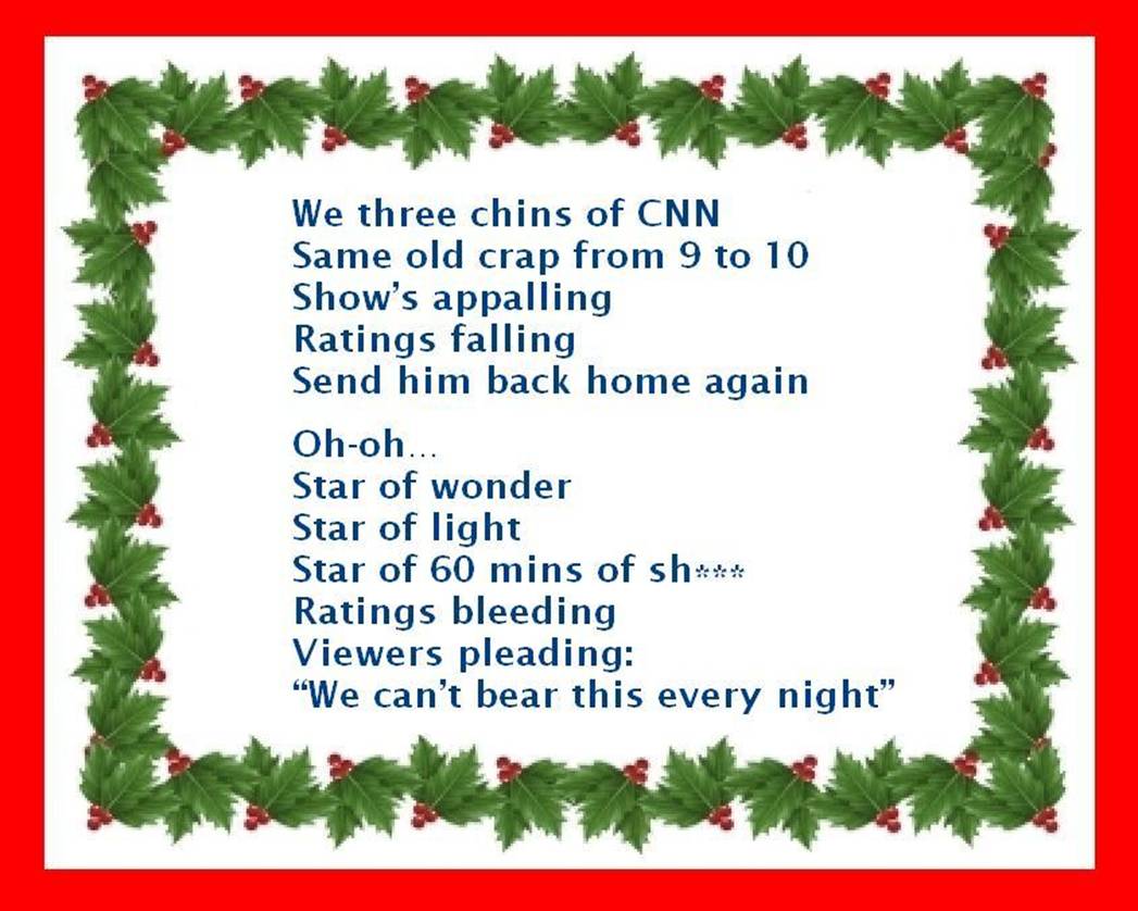 Oh come, get a facefulOf a silly moronOh come ye oh come yeTo Cee-ee-N-NCome and behead himRatings are abysmalJust come, for we abhor himOh come, for we abhor himOh come for we abhor hi-imMorgan, the twat!